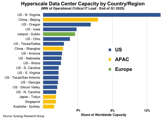 Nové údaje společnosti Synergy ukazují, že pouhých dvacet státních (ve smyslu států USA) nebo metropolitních trhů představuje 62 % současné kapacity hyperškálovaných datových center. Severní Virginie a oblast Velkého Pekingu tvoří samy o sobě 20 % celkového objemu. Následují je americké státy Oregon a Iowa, Dublin, americký stát Ohio, Dallas a poté Šanghaj. Z 20 nejvýznamnějších oblastí hyperškálovaných datových center se 14 nachází v USA, 5 v regionu Asie-Tichomoří a pouze 1 v Evropě. Amsterdam a Frankfurt bývaly v top 20, ale nedávno z tohoto žebříčku vypadly.