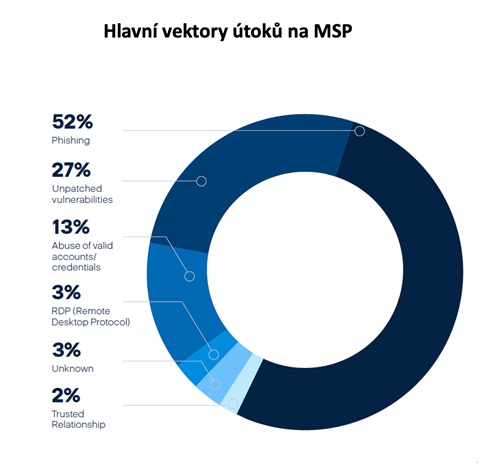 • MSP pod palbou phishingových a BEC útoků: zatímco celkový počet útoků zaměřených na MSP (poskytovatele řízených služeb) během měřeného období poklesl, povaha útoků se výrazně změnila; phishing tvořil 52 % všech útoků zaměřených na MSP, zatímco v roce 2024 to bylo 30 %, zatímco útoky pomocí protokolu RDP (Remote Desktop Protocol) téměř vymizely.